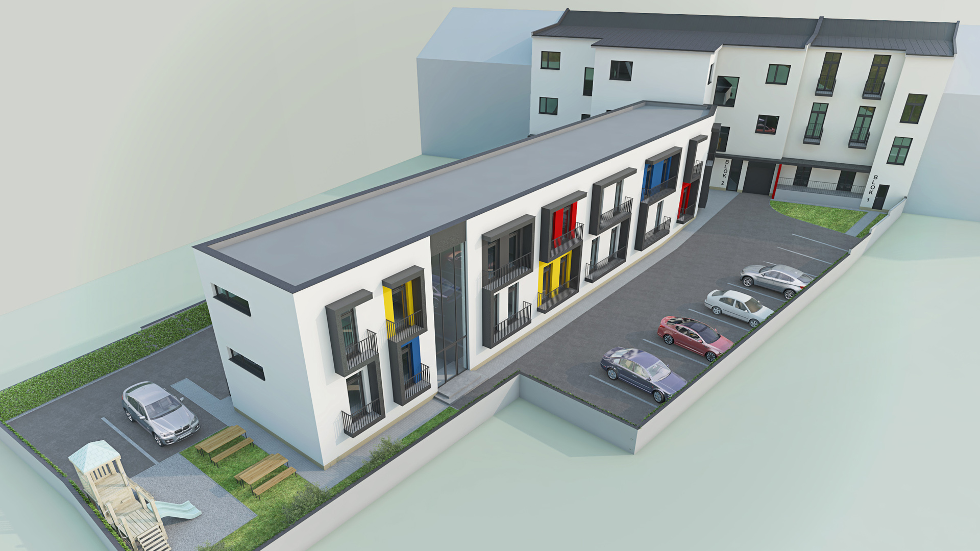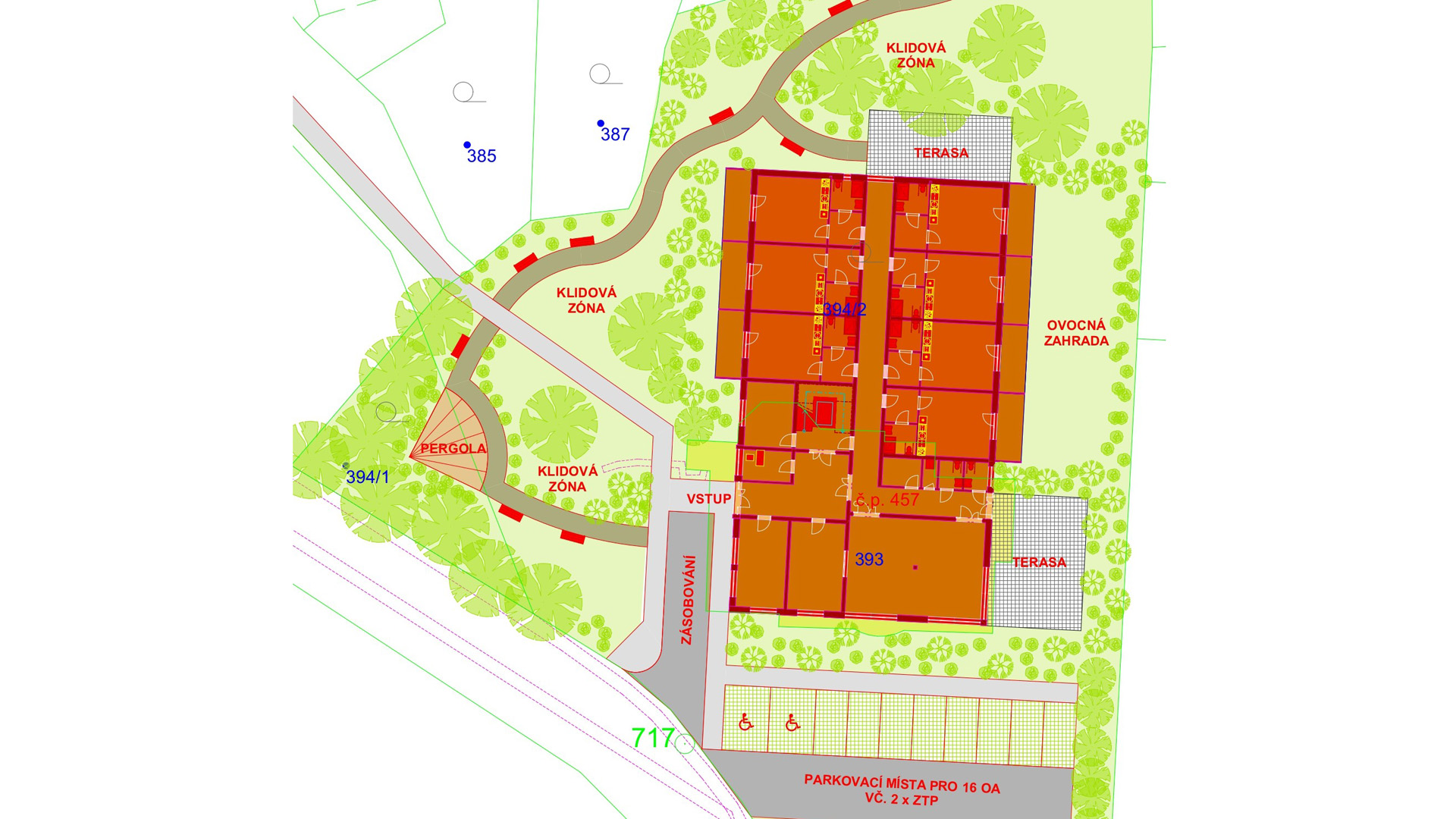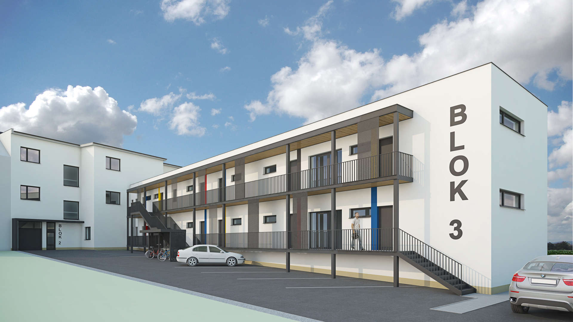 Dvorní prostory byly navrženy převážně pro parkování osobních automobilů.