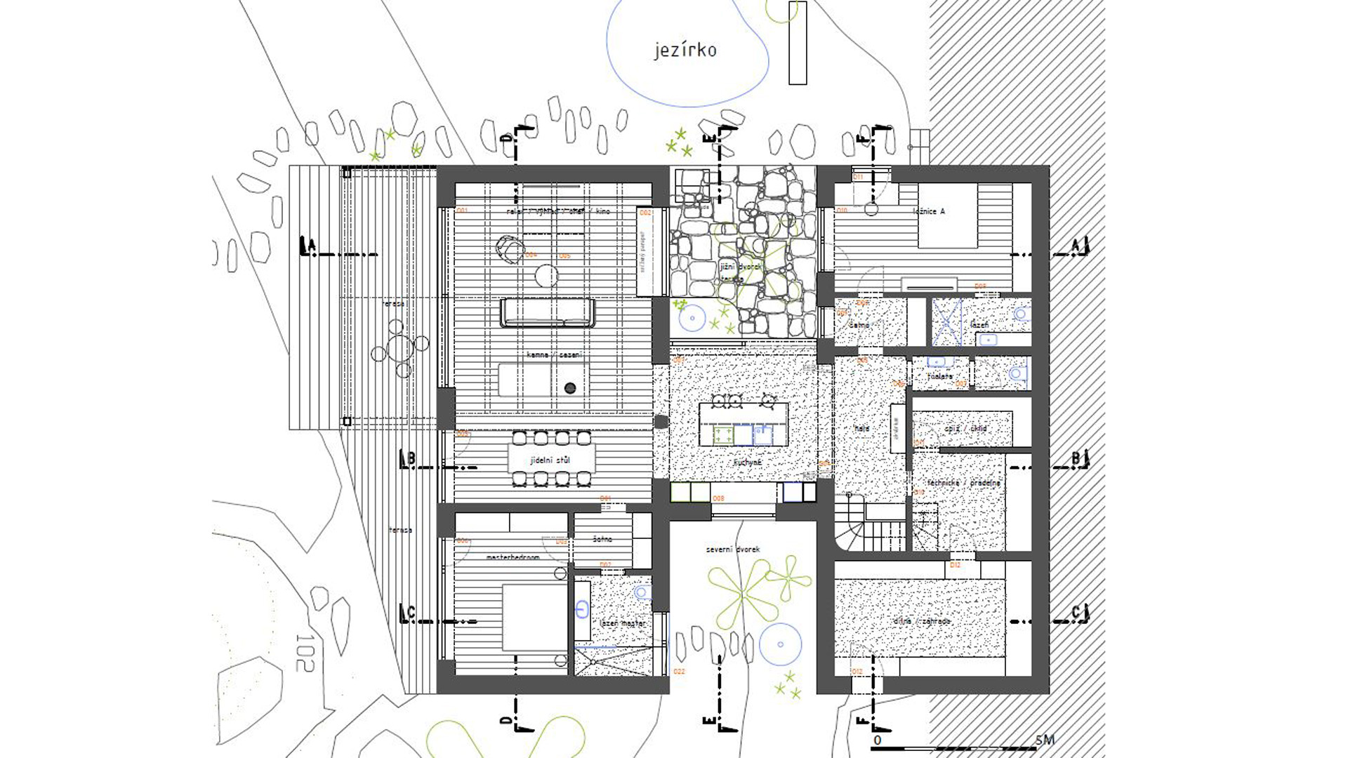 Hlavním přáním a požadavkem investora bylo mít pokud možno přímý kontakt s terénem ze všech místností a nerušený výhled do krajiny.
