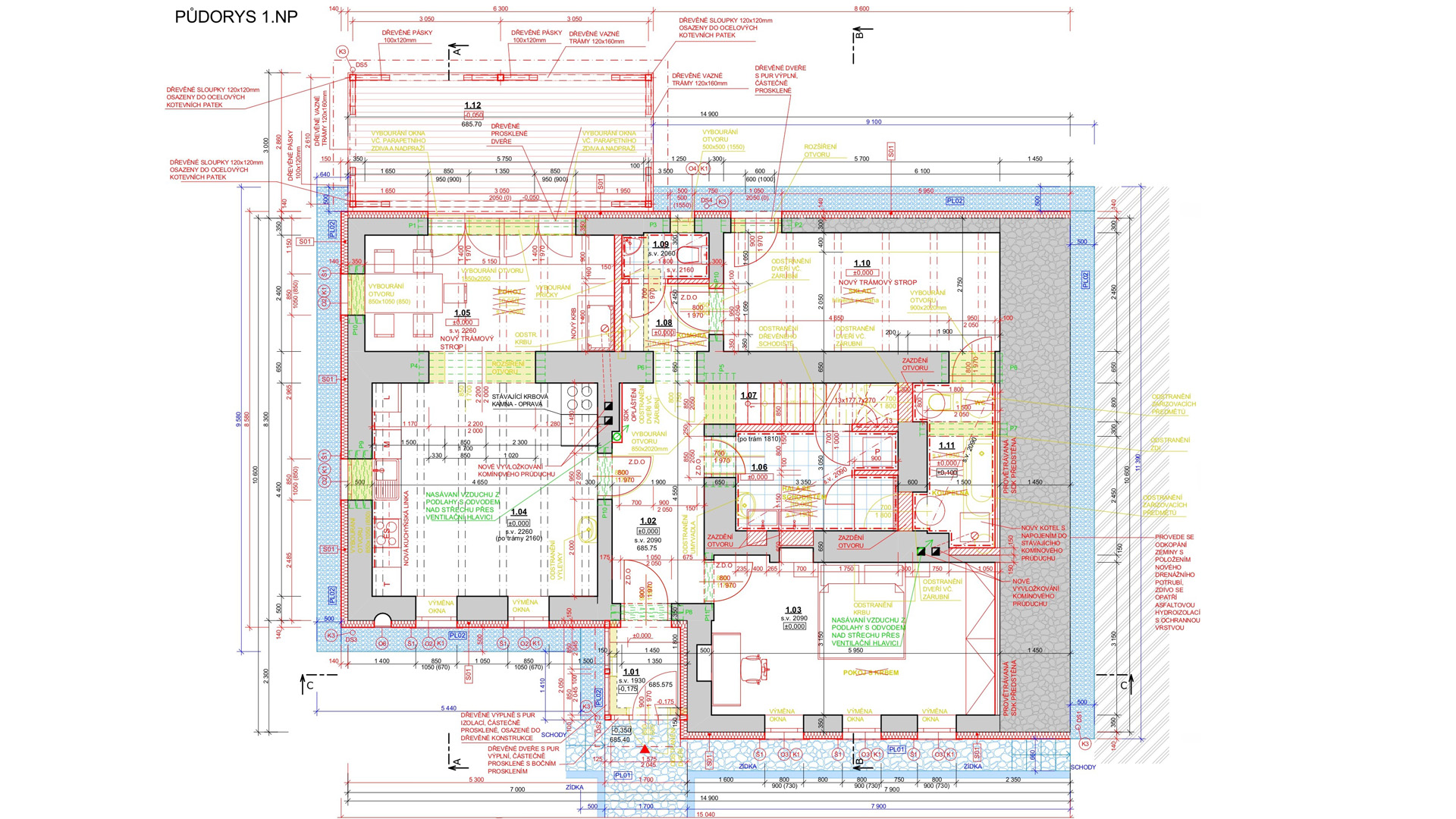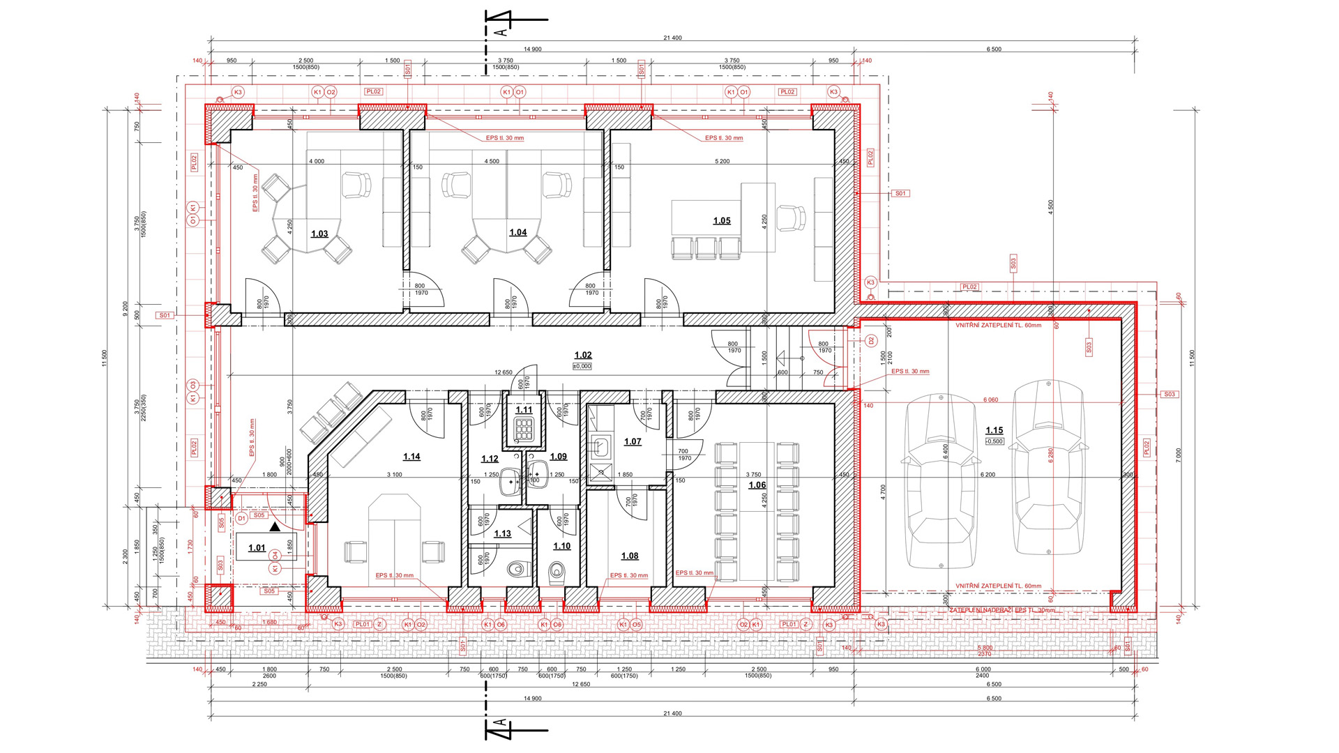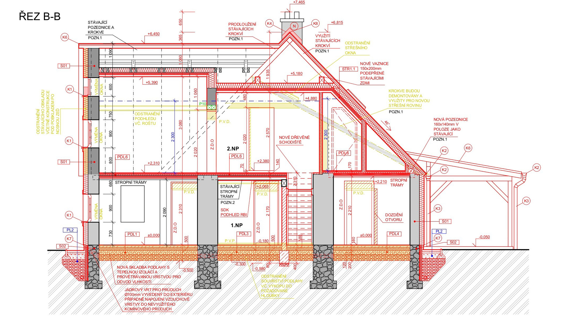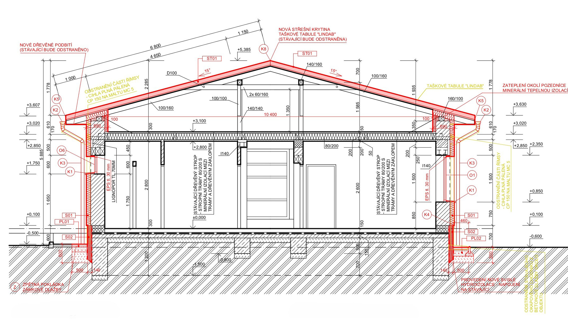 Pro objekt se navrhovalo nové zateplení, nový tvar střešní konstrukce a nové řešení podlahy na terénu pomocí provětrávaných IPT desek.