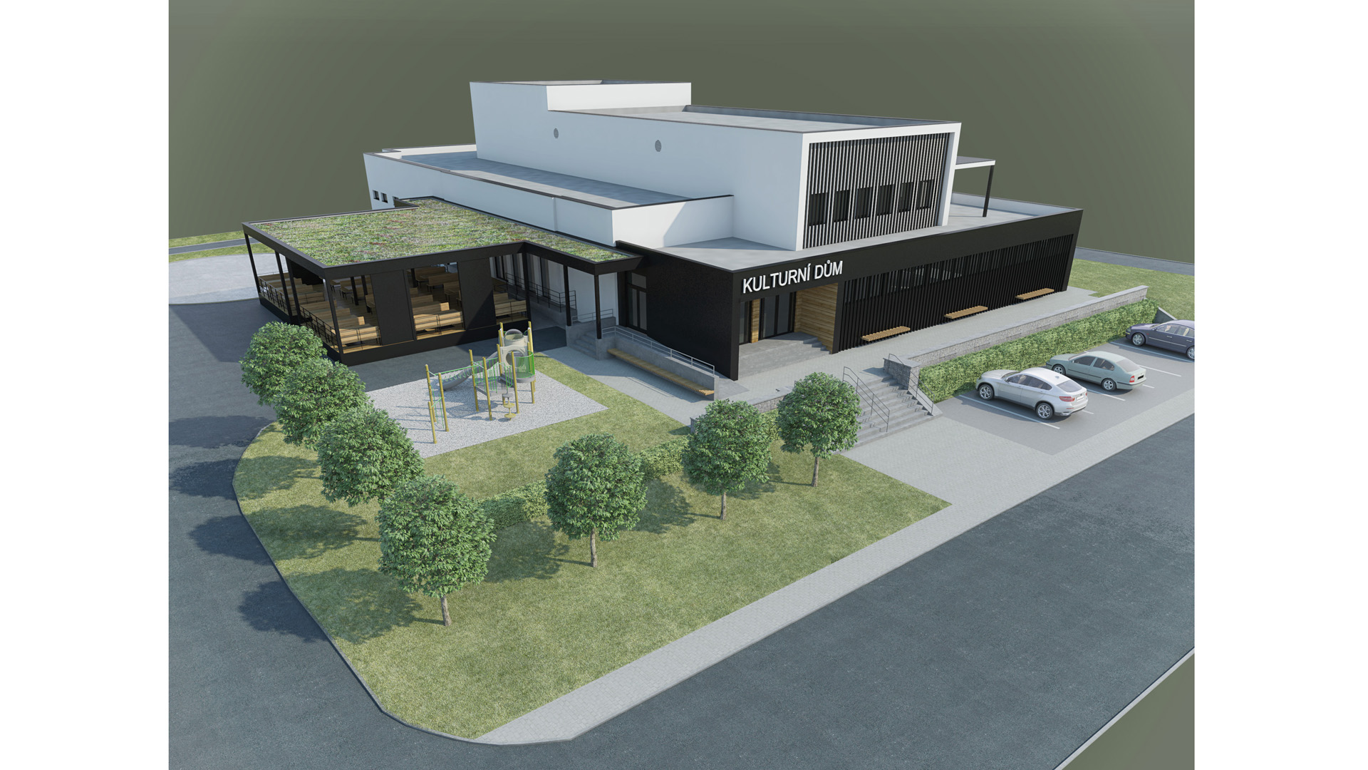 Střecha domu byla navržena jako plochá zelená s prosvětlovacími střešními světlíky.