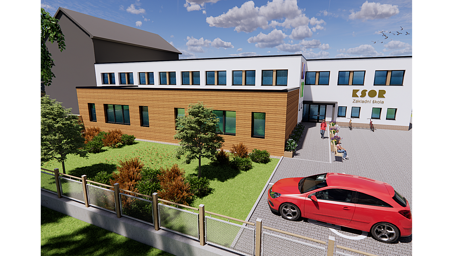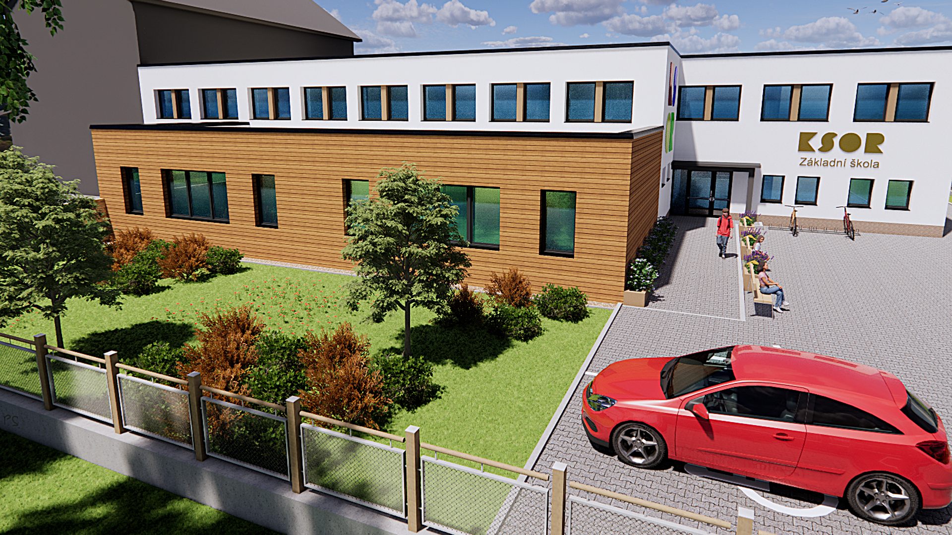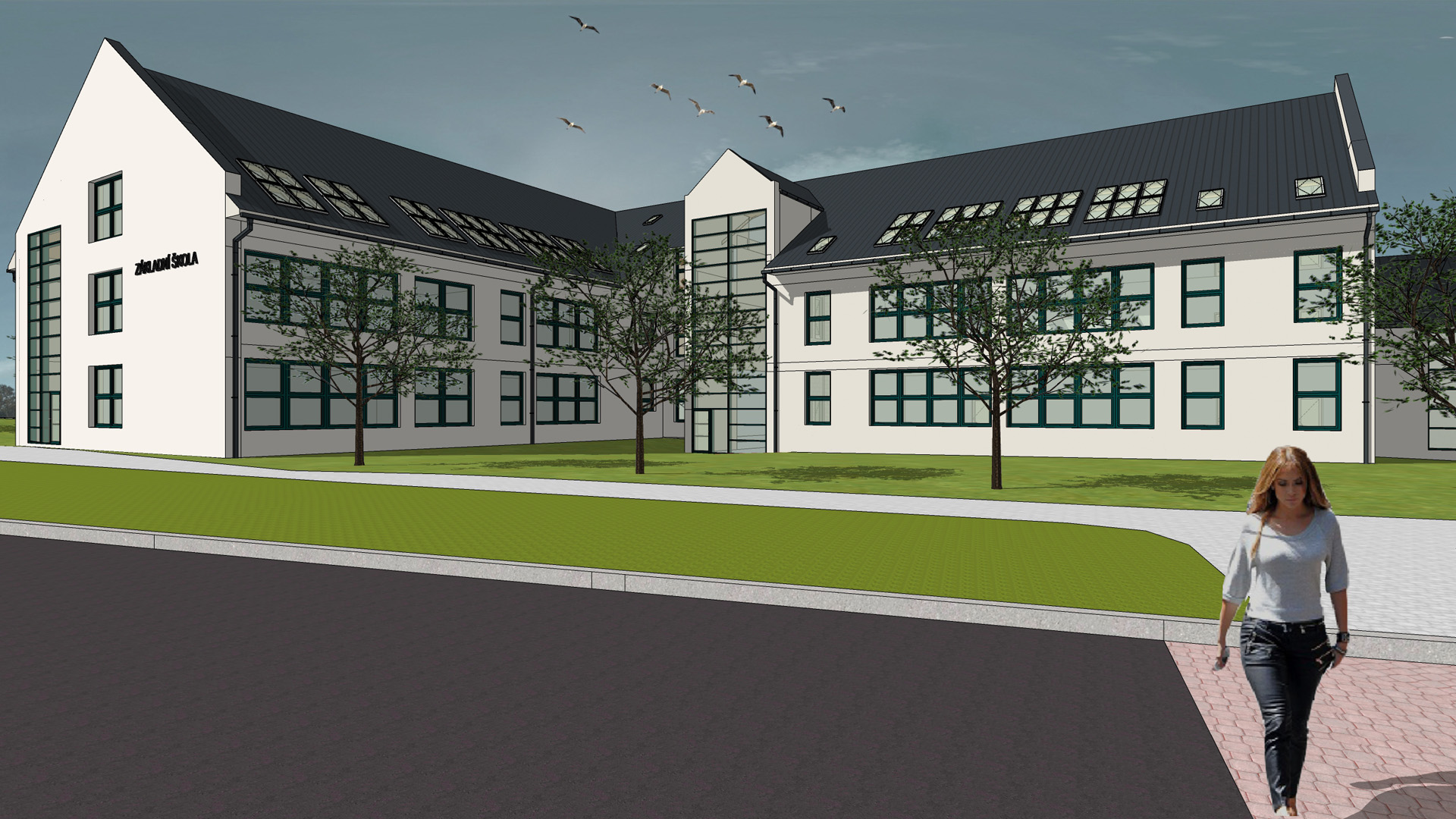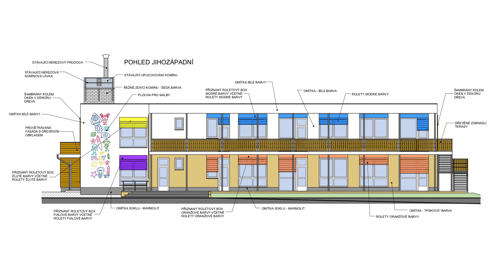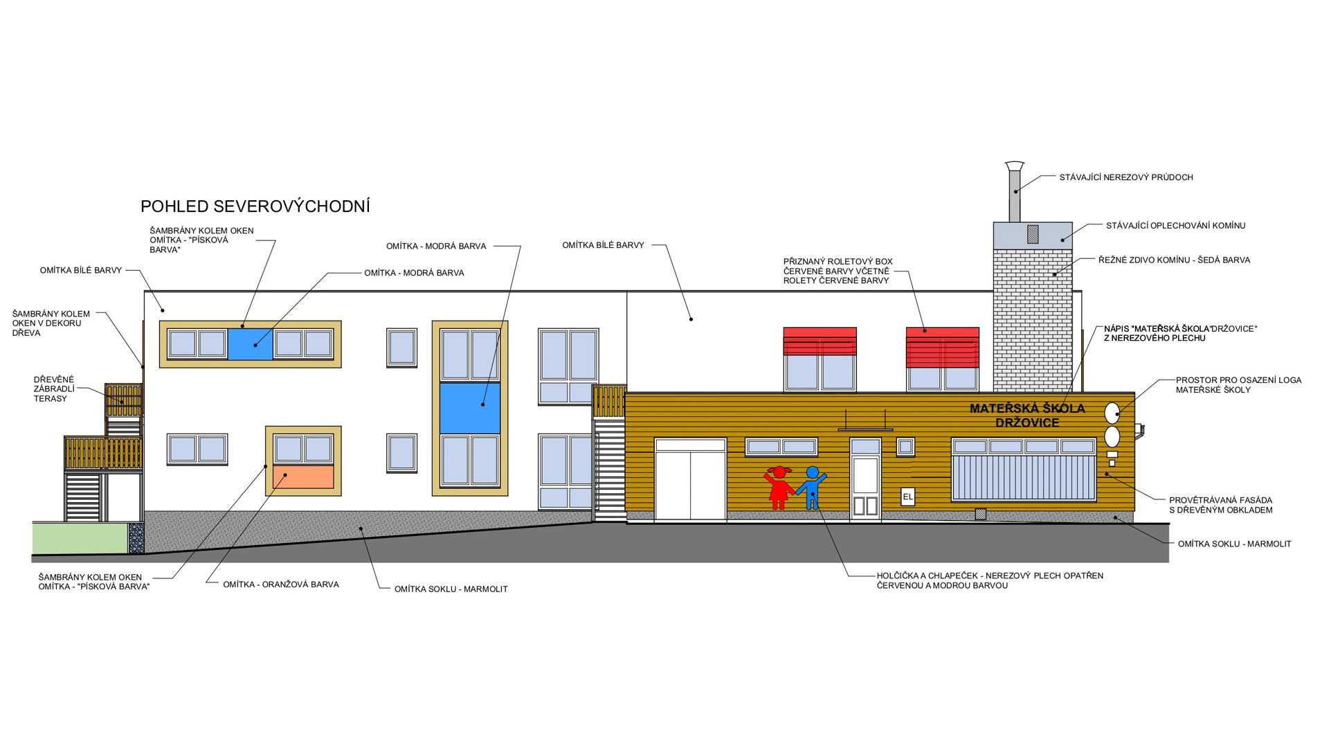 Přístavba se navrhovala tak, aby byla propojena se stávající budovou a v rámci návrhu se dále řešilo zateplení stávající budovy, denní osvětlení a celkový vzhled jak přístavby, tak i stávající budovy včetně řešení venkovních ploch a hracích prvků.