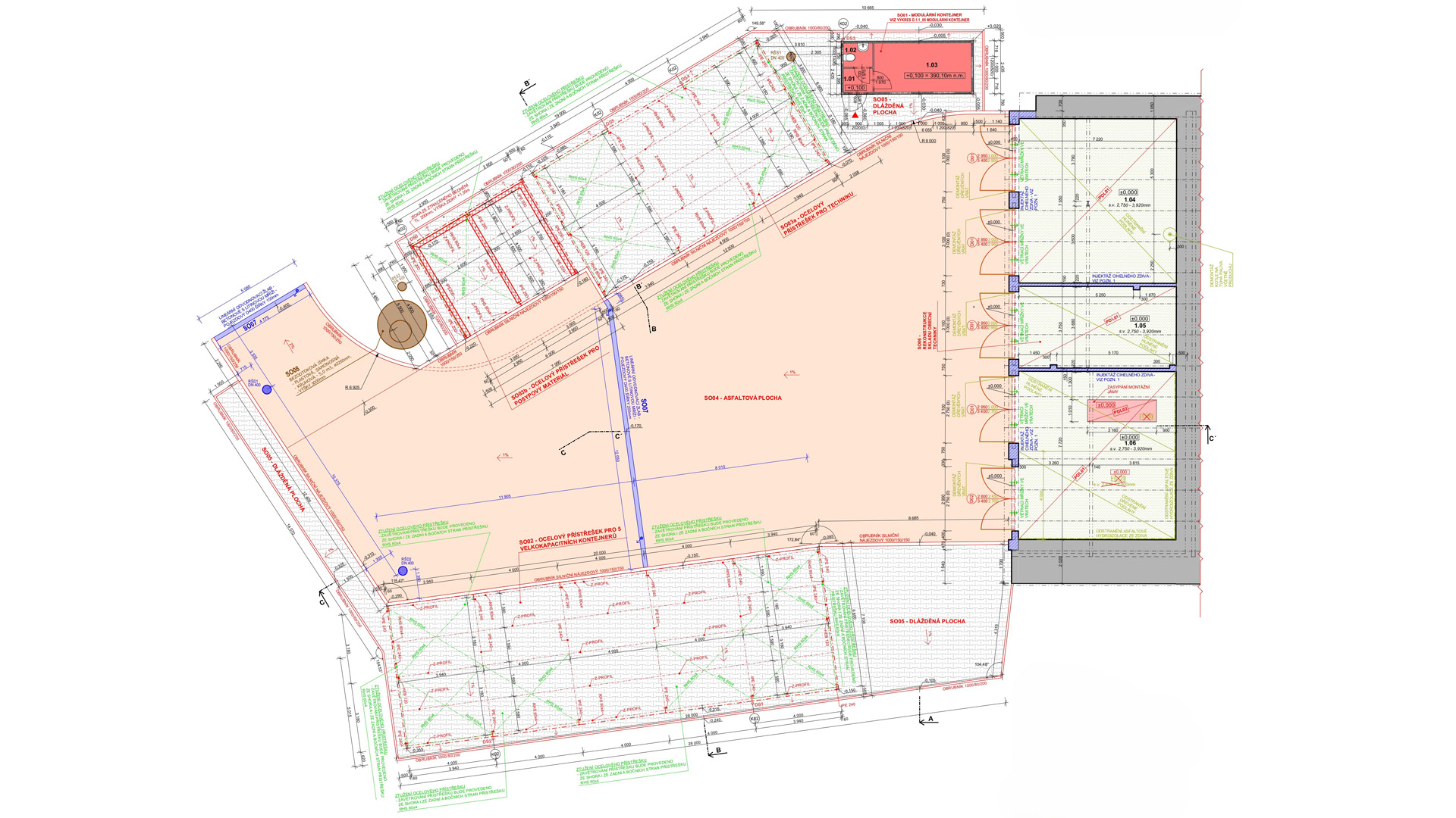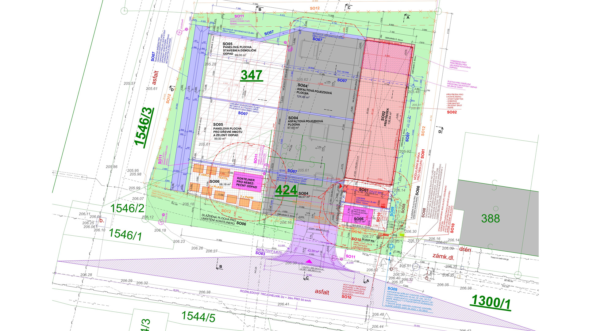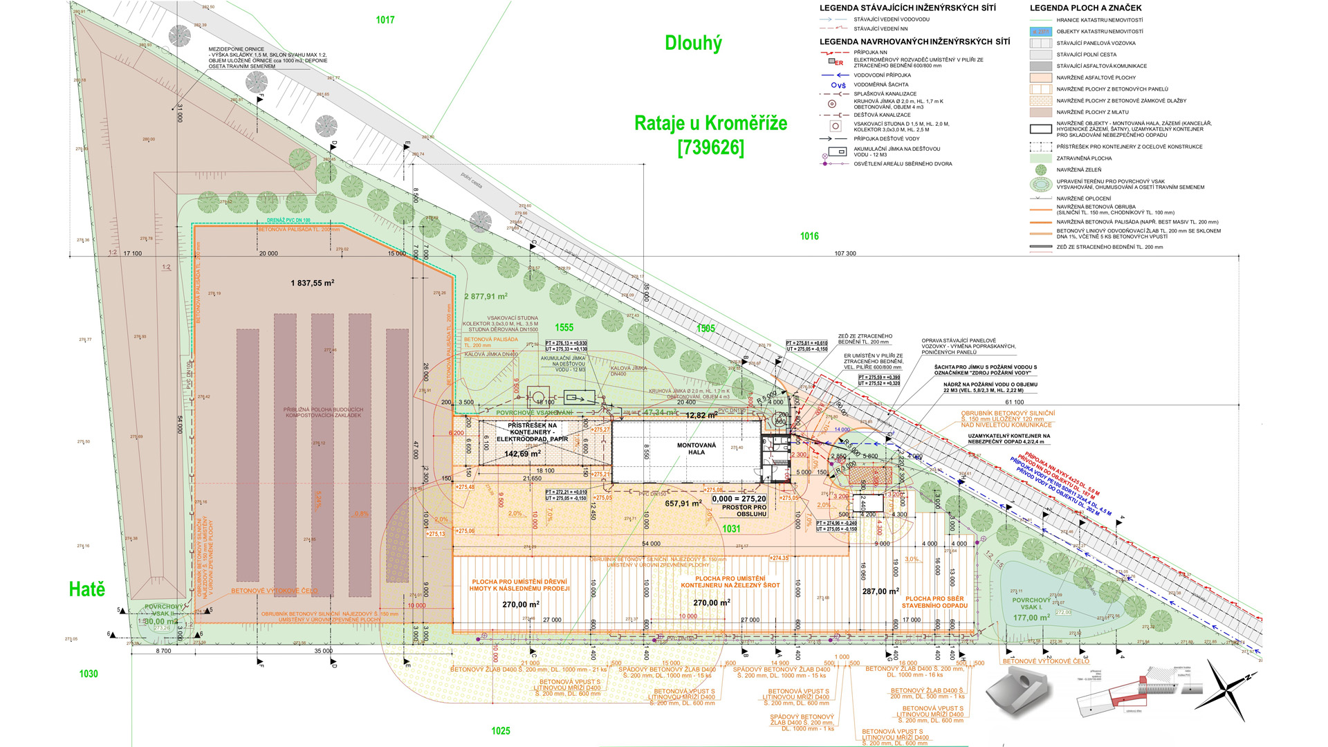 Jednalo se o rozsáhlý areál, kde se navrhovala ocelová opláštěná hala, zázemí pro zaměstnance, ocelový přístřešek a zpevněné plochy pro kompostárnu a pro ukládání jednotlivého materiálu.