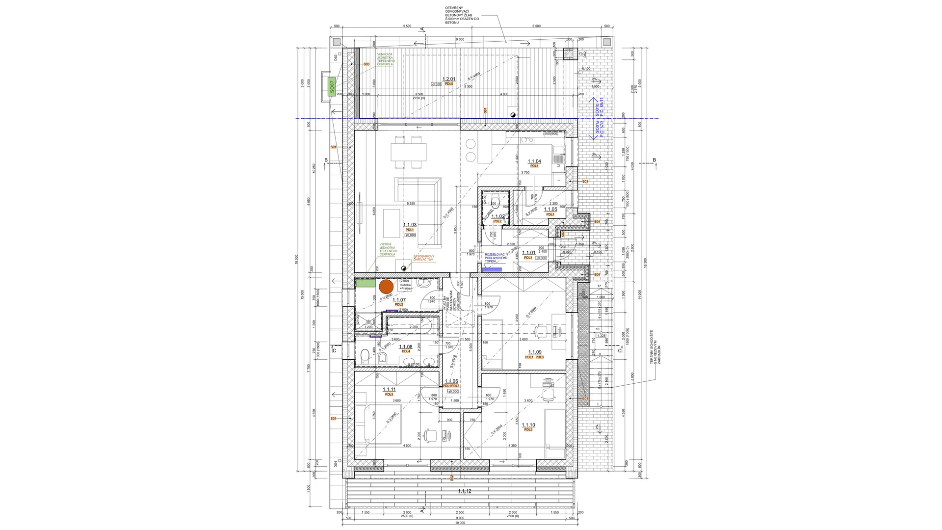 Dům je řešen jako dvoupodlažní, kde v 1.PP se nacházelo technické zázemí s parkovacími místy. V 1.NP se navrhla obytná část dispozičně řešena 4+KK s balkónem a krytou terasou.