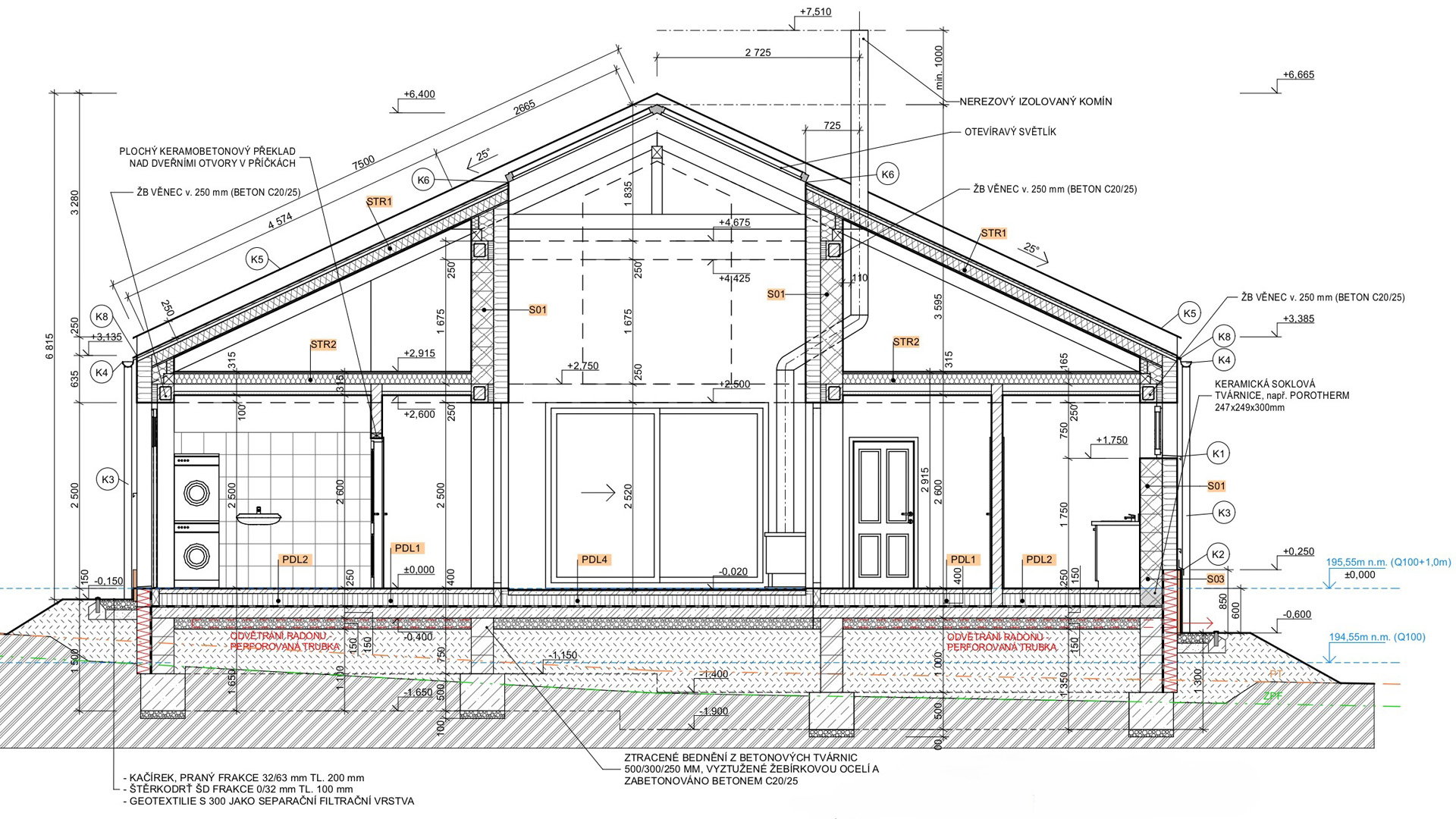 Jednalo se o návrh zděného domu s kontaktním zateplovacím systémem, který bylo nutné navrhnout nad záplavovou hladinou Q100.
