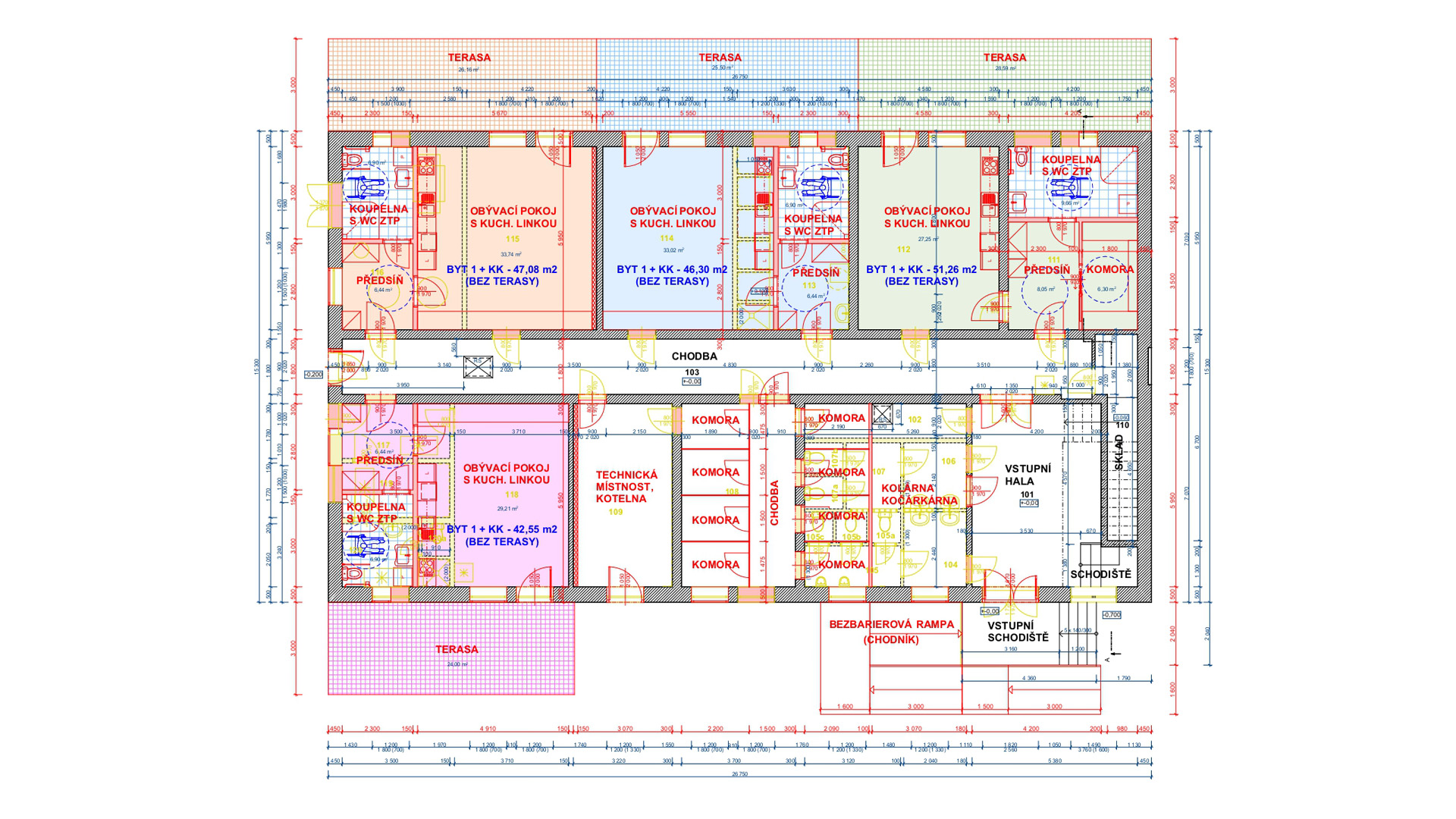 Bytové jednotky v 1.NP jsou navrženy tak, aby byly využívány i osobami s omezenou schopností pohybu.