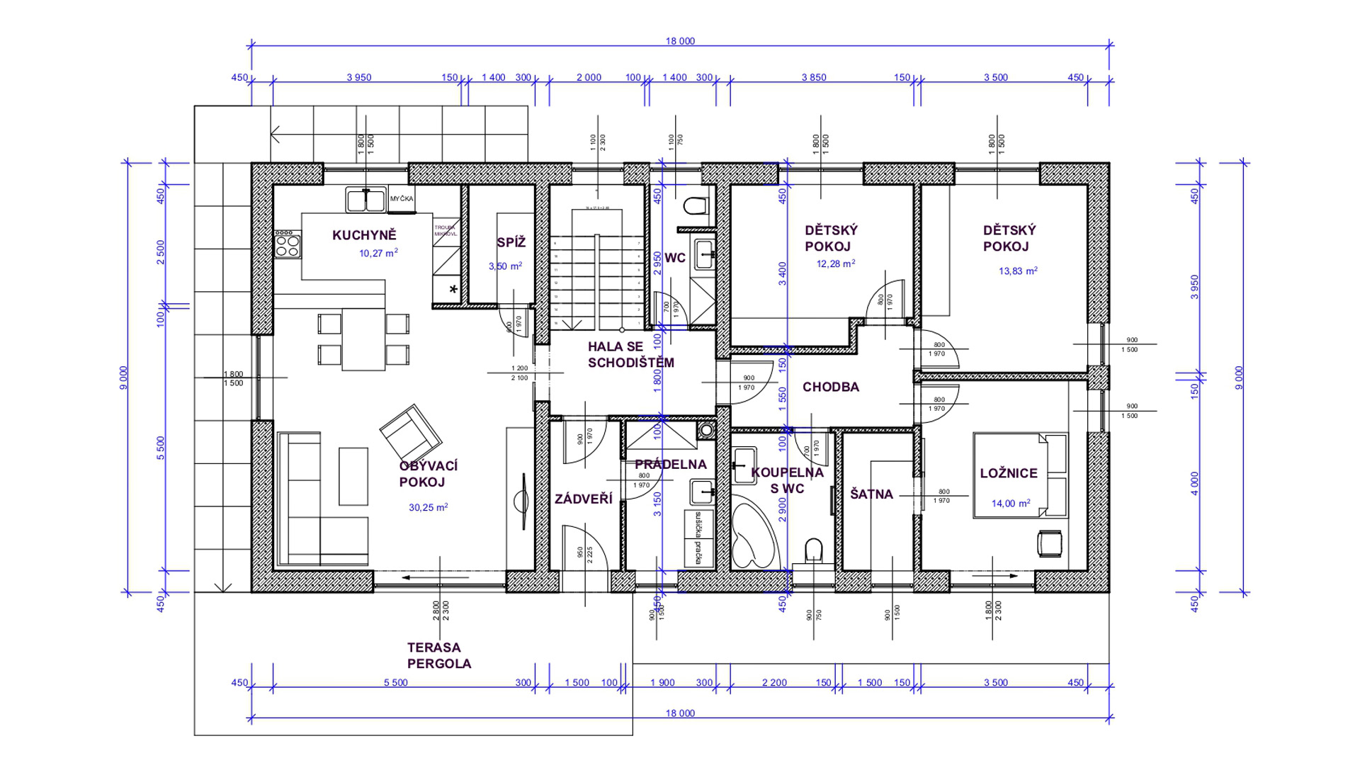 Zastavěná plocha domu je cca 250 m2 (bez teras).