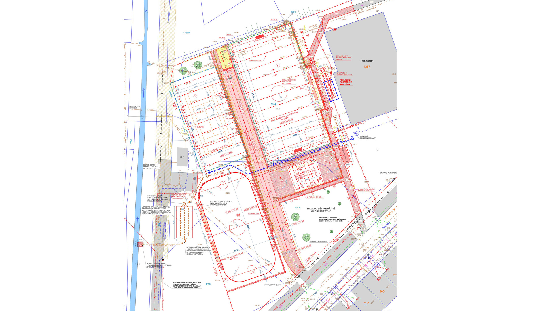 Byly upraveny a rozšířeny i inženýrské sítě. Navrženy byly rovněž nové zpevněné plochy a převlékárny se sprchami.